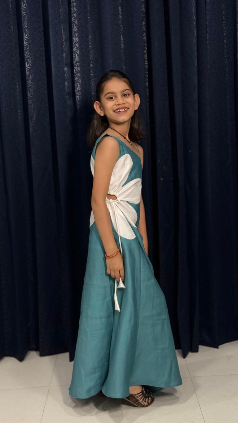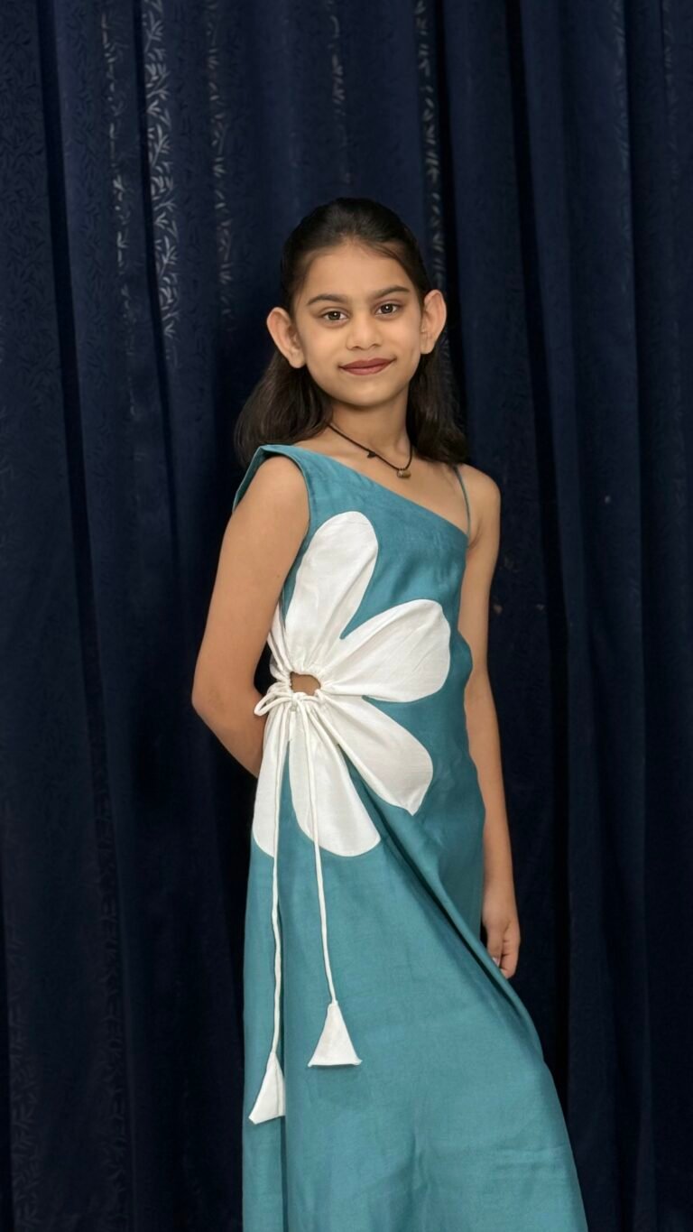 Dress your little girl like a princess in this stunning teal one-shoulder maxi dress with a bold white floral appliqué and gold ring detail. Elegant, unique & absolutely adorable! 🌸