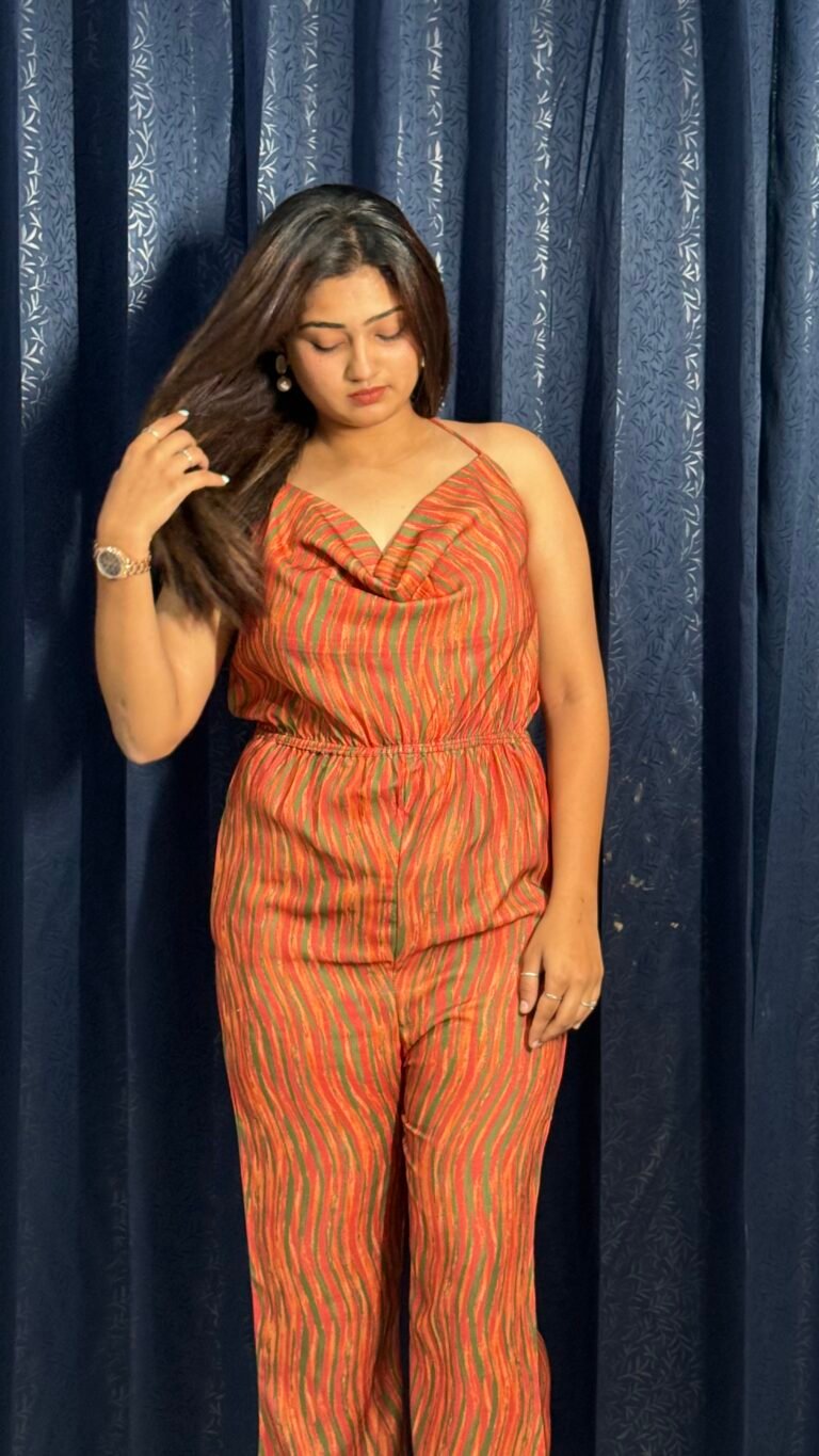 Bold, breezy & totally chic — this orange & green striped halter jumpsuit with a cowl neckline and elasticated waist is the one-piece wonder your wardrobe has been waiting for!