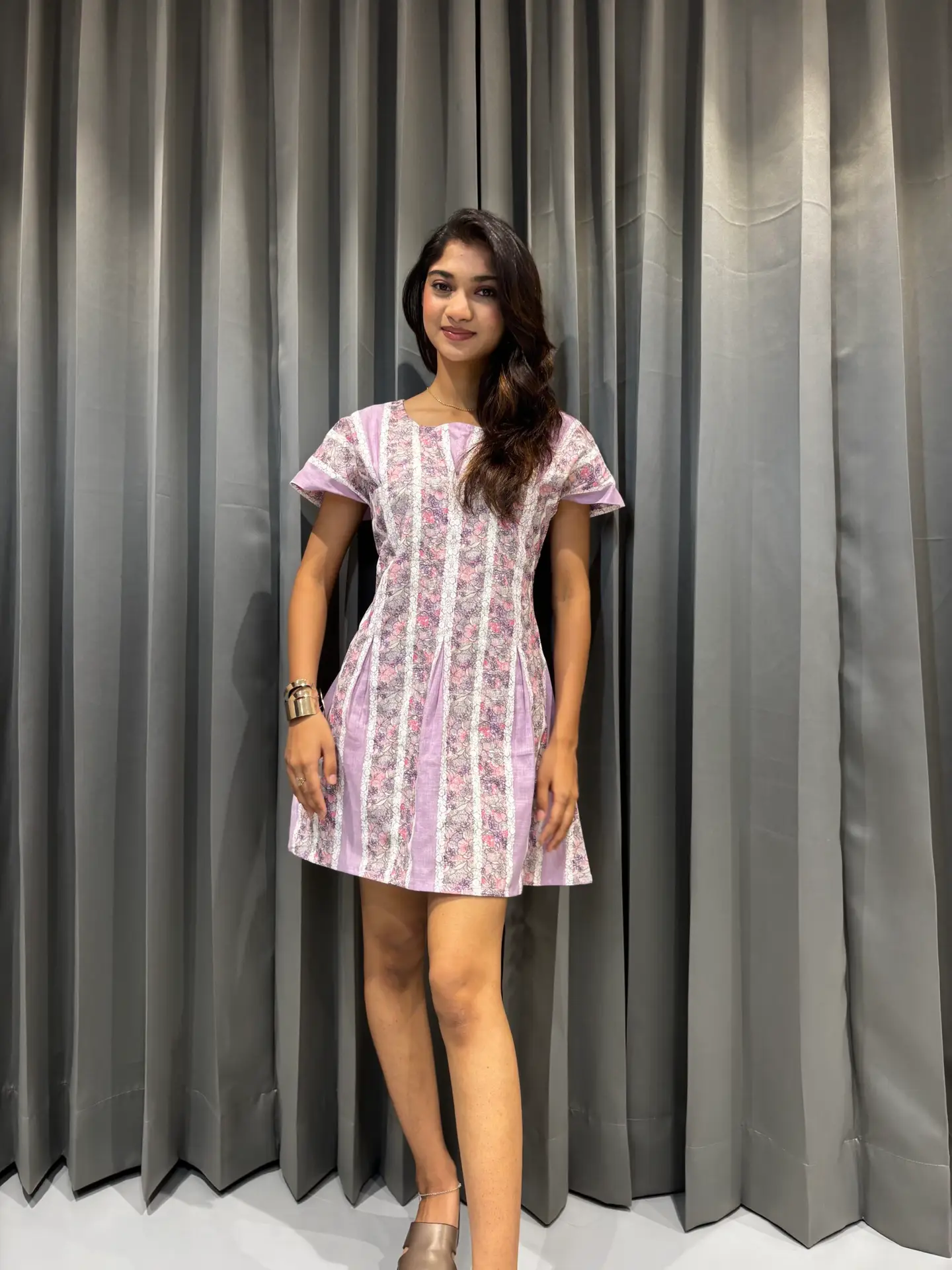 The silhouette is a fit-and-flare style, slightly cinched at the waist and flowing outward into a playful, above-knee hemline, giving it a light and graceful movement. The fabric appears soft and breathableโperfect for daytime outings, casual brunches, or summer gatherings