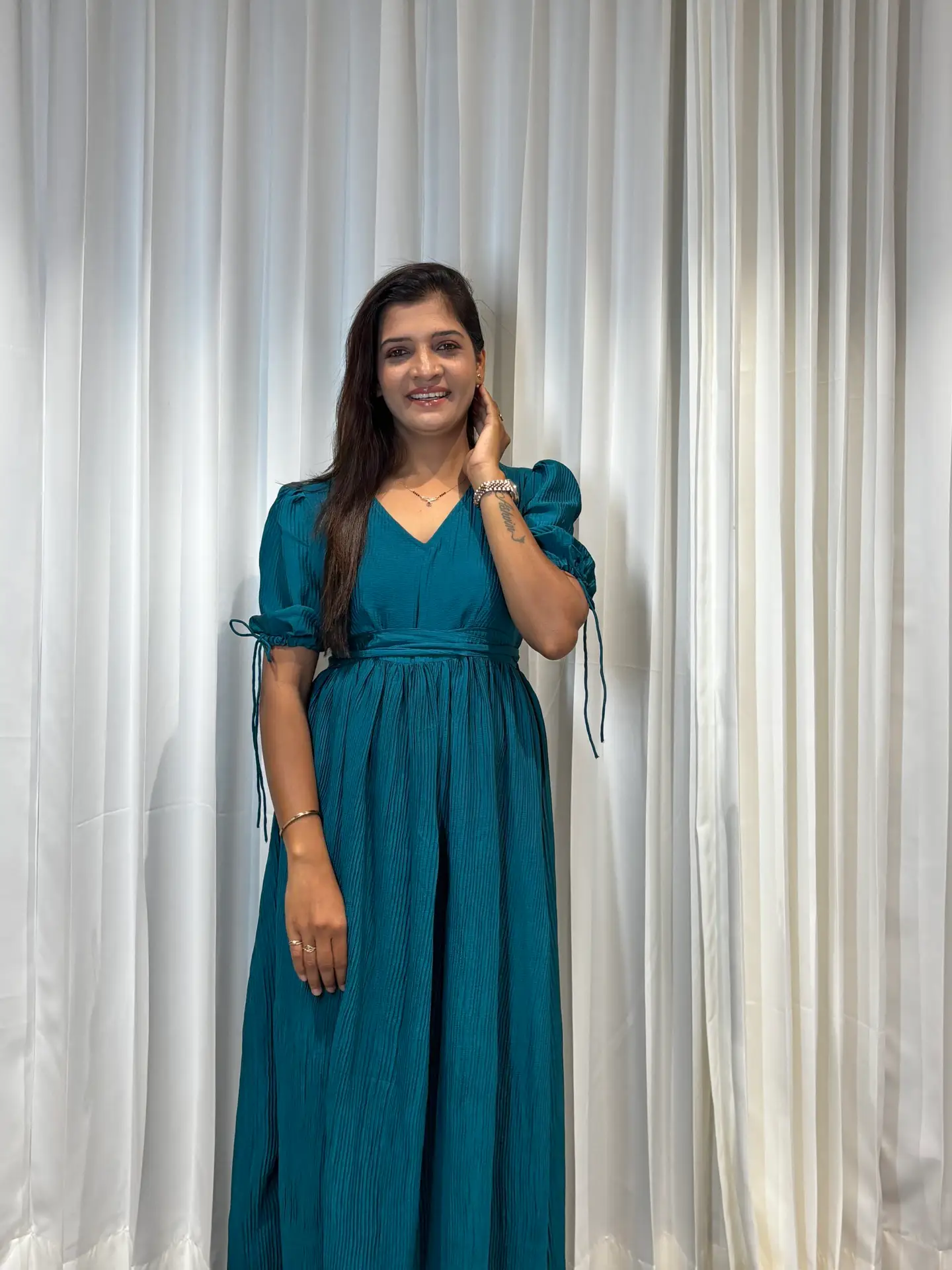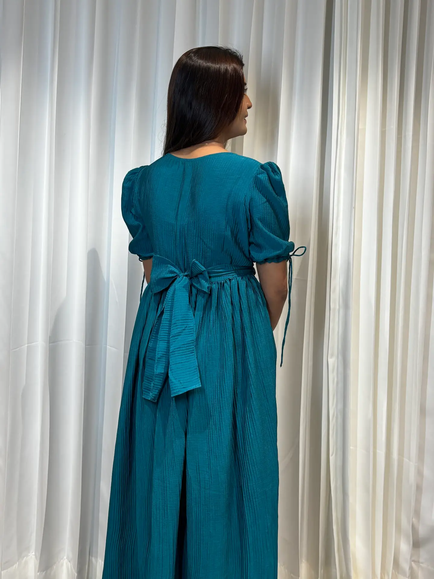 A graceful blend of elegance and comfort, the Ocean Whisper Tie-Back Dress flows effortlessly with every step. Crafted in a rich teal hue reminiscent of calm ocean waves, this dress features a softly gathered silhouette that flatters the form while allowing ease of movement. The delicate puff sleeves with adjustable tie details add a touch of charm, while the statement back bow creates a beautifully feminine finish. Perfect for day-to-evening wear, this piece speaks of quiet confidence, simplicity, and timeless style.