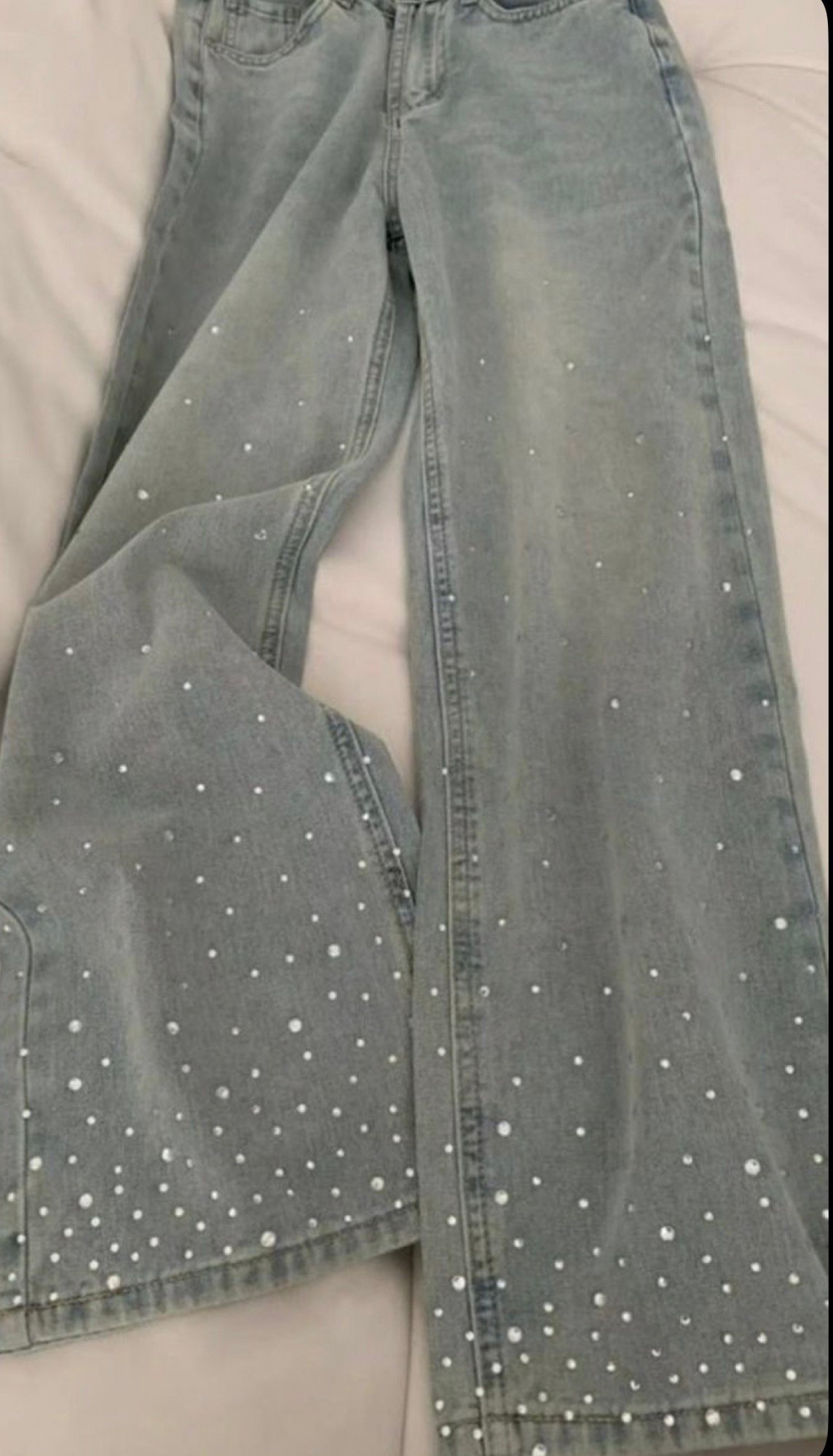 Unlike bold embellishments, these jeans feature delicate all-over scattered pearl studs spread evenly across the entire length of both legs — from hip to hem — creating a soft, elegant sparkle that works for both day and night looks.